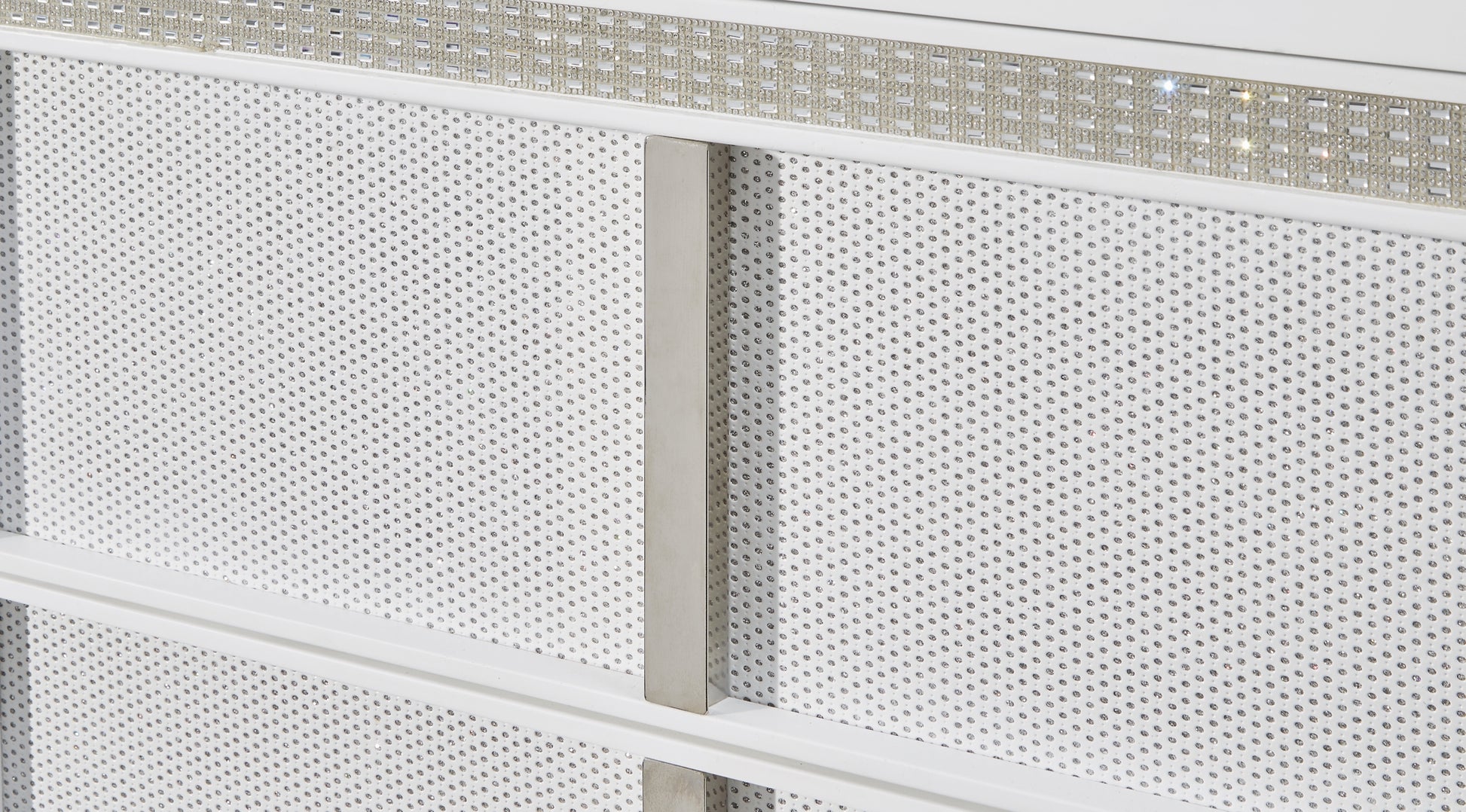 Details | Made with solid wood components, MDF substrate and decorative laminate, White lacquer finish, Vertical metal drawer pulls, Built-in LED lighting with 3-way dimmer switch, 2 drawers with fully finished interior, dovetail construction and heavy duty ball-bearing side glides, Drawers with rhinestone frames; textured laminate drawer fronts, 110V power supply with USB-A and USB-C charging ports, Power cord included; UL Listed | |