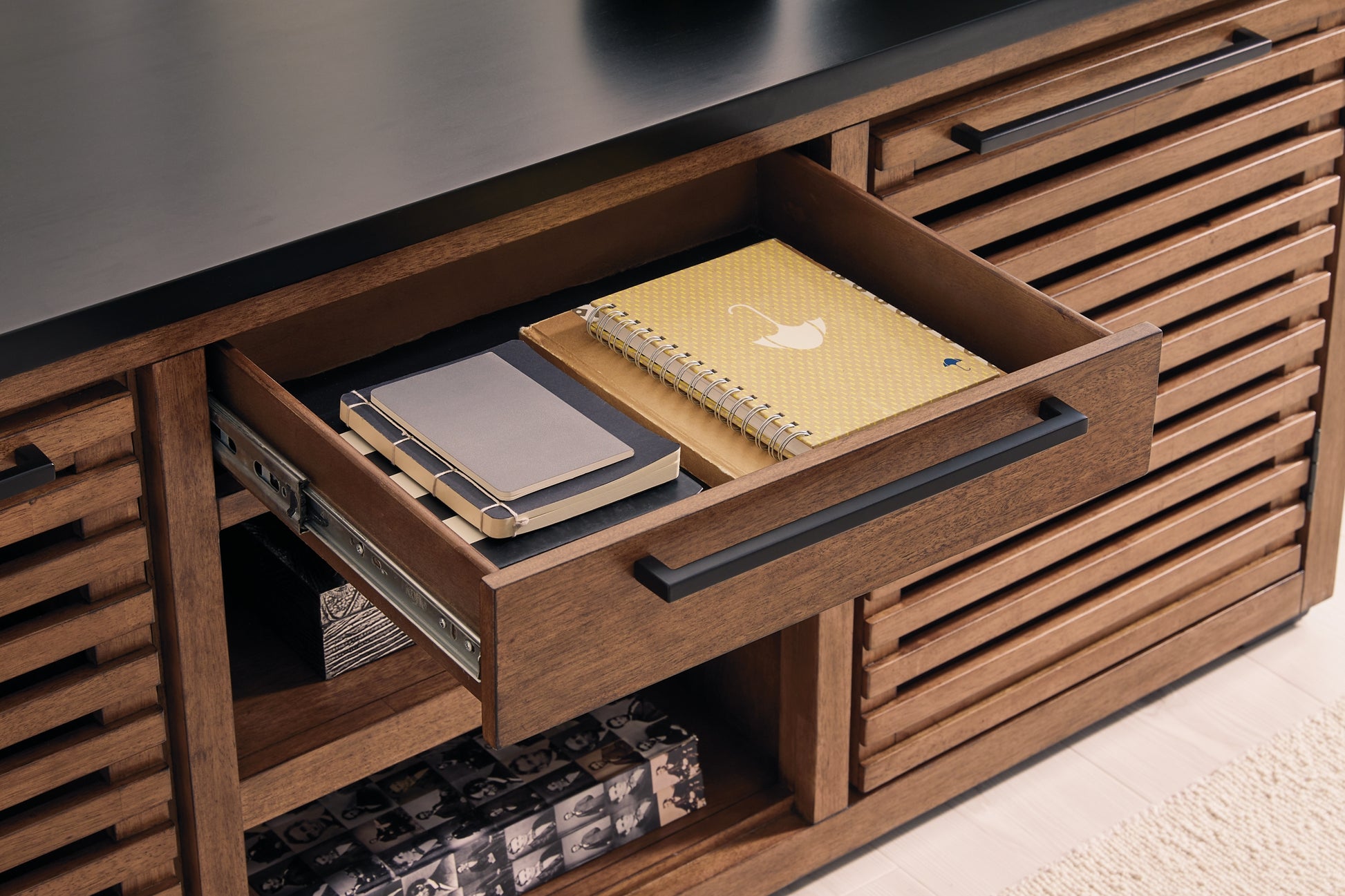 Double down on casual chic with the two-tone look of this credenza with desk return. With its warm brown and matte black finishes, it reflects your eye for modern design. Trend-right slatted styling on the doors brings added charm. The desk can sit on either side of the credenza for added flexibility in compact spaces. And with its adjustable shelves, open storage and accessories drawer, keeping home office essentials organized is a breeze.