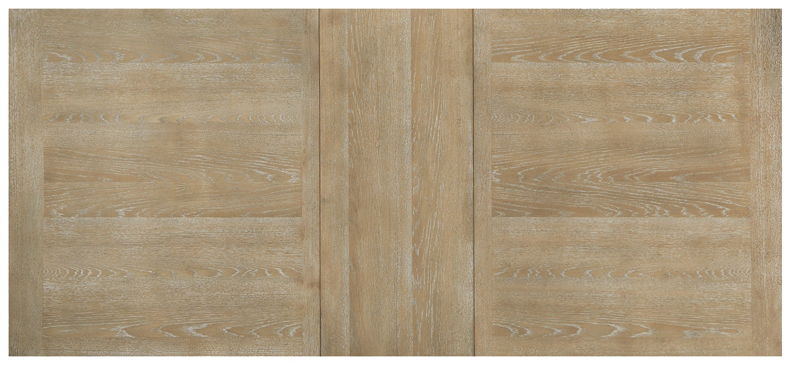 Details | Made with hardwood solids, select veneers and MDF substrates, Two-tone finish (antiqued white and light grayish brown wood tone), Double trestle base, Removable center leaf stores conveniently underneath the tabletop, Table extends by pulling both ends and dropping in leaf, Seats up to 8, Assembly required | |