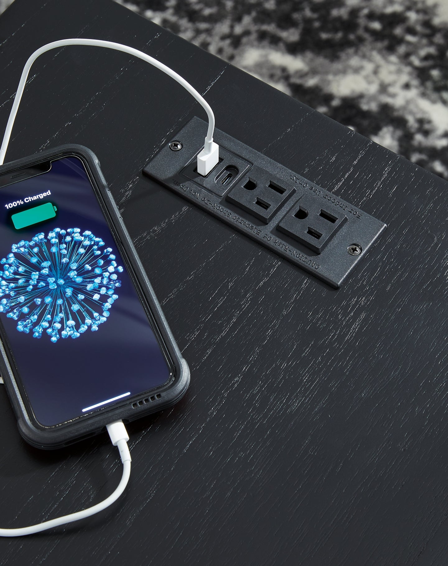 Details | Made with hardwood solids, mindi veneer and MDF substrate, Black finish with wood grain texture, 2 shelves, 110V power supply with USB-A and USB-C charging ports, Power cord included; UL Listed | |